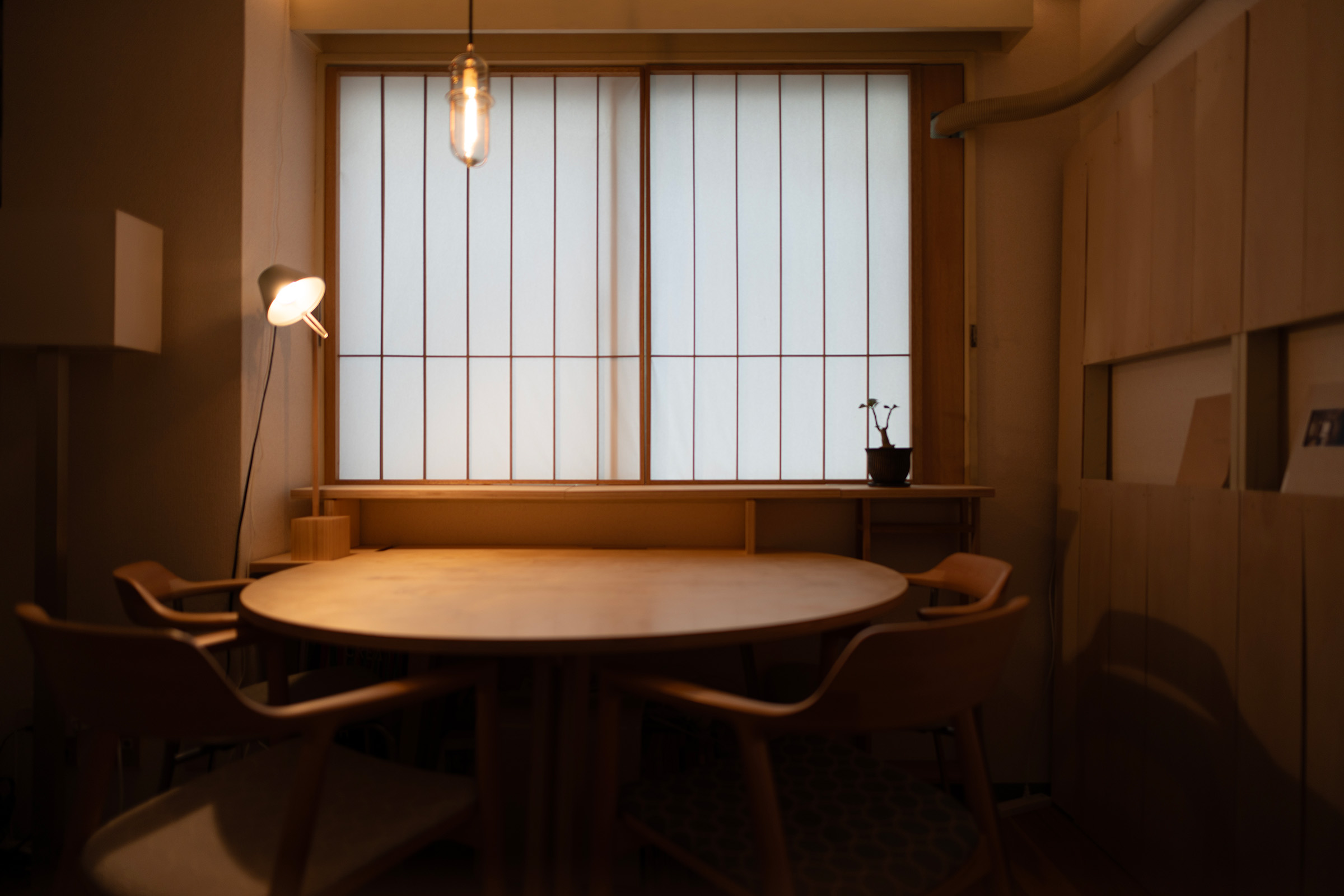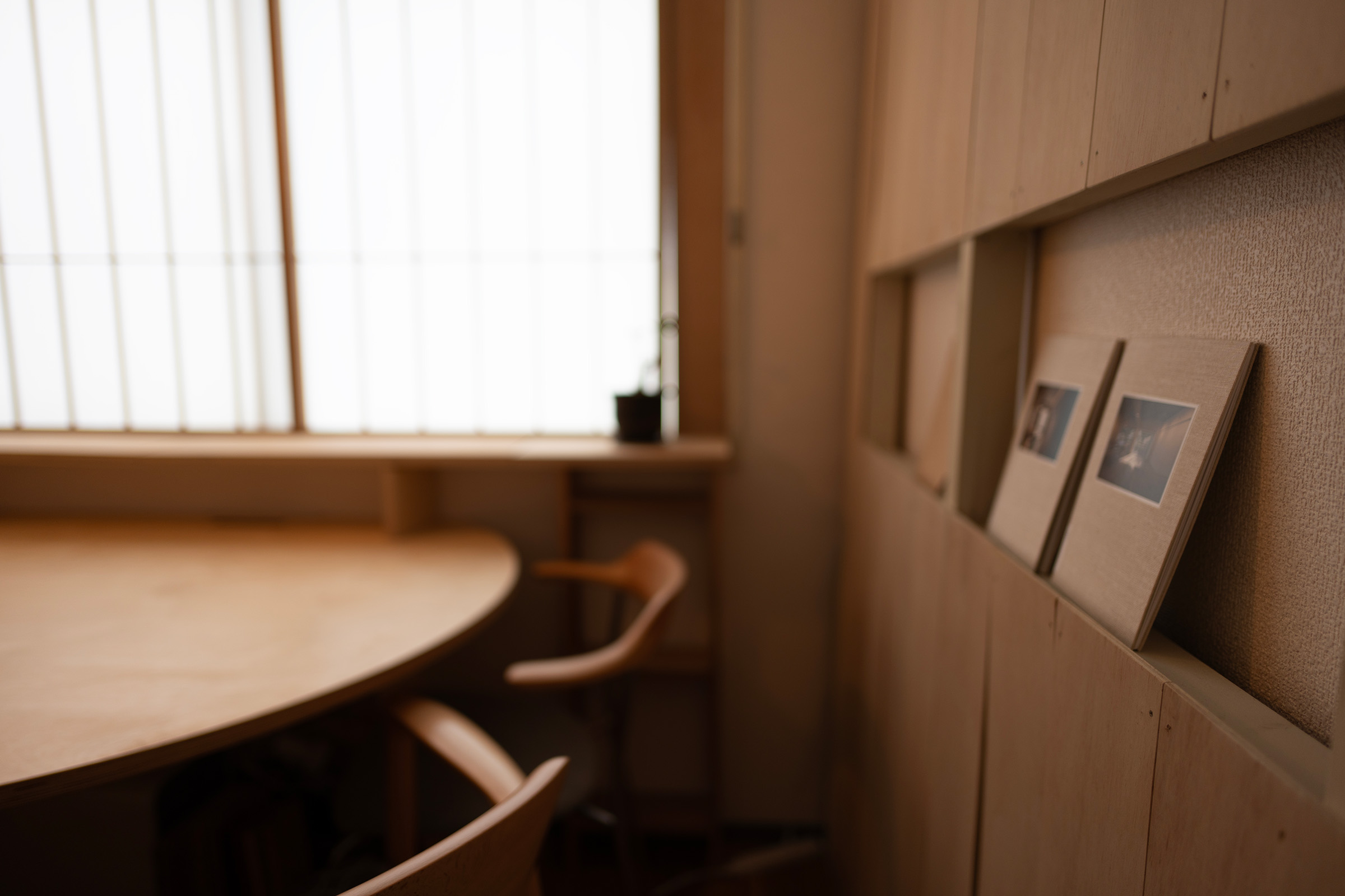 既存の床や壁、窓の表層部分に新たなレイヤーを加えることで落ち着きのある空間を作り出している。隣地の建物が迫る窓には柔らかい光を取り入れるため障子を入れている。