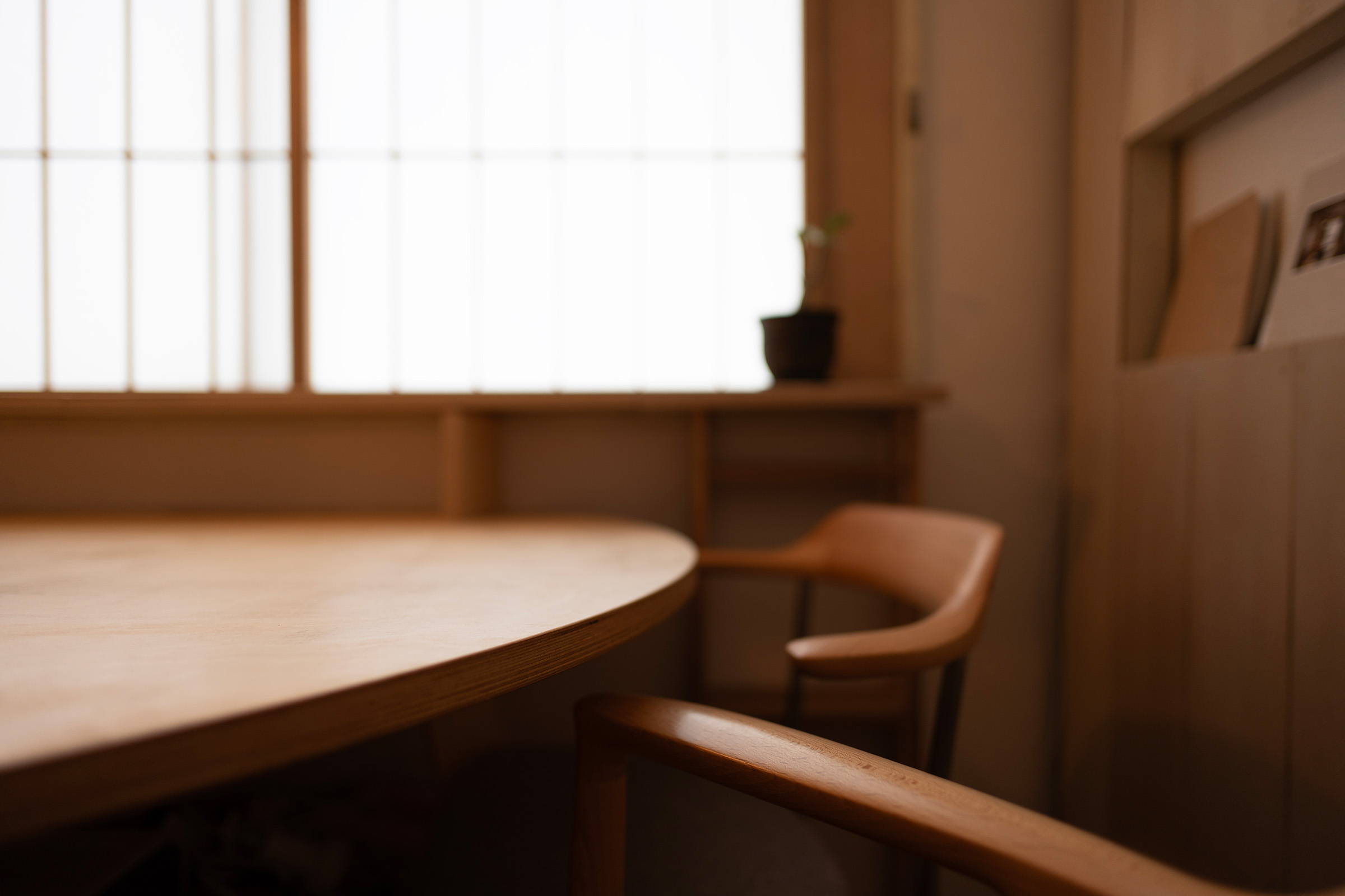 部屋の中心には円形のテーブルを配置している。建物を作り上げていく中で、施主は想いを込める。設計者は空間を創造し秩序を造る。施工者はこれらを最適な形へと作り上げていく。3者が中心に向き合うことで、同じ方向を目指し進んでいく事をテーブルの形に落とし込んでいる。共に進んでいく形を表現している。