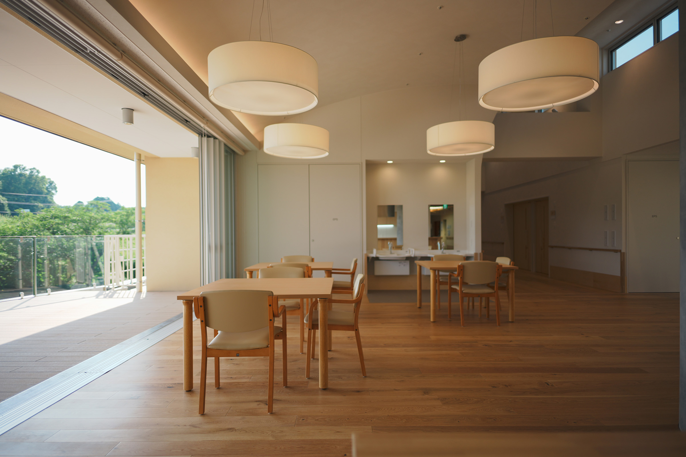 共同生活室はフルオープンにできるウッドデッキと繋がり、気軽に日光浴ができるようになっています。周辺環境を大きく取り込んで快適に過ごすことができます。