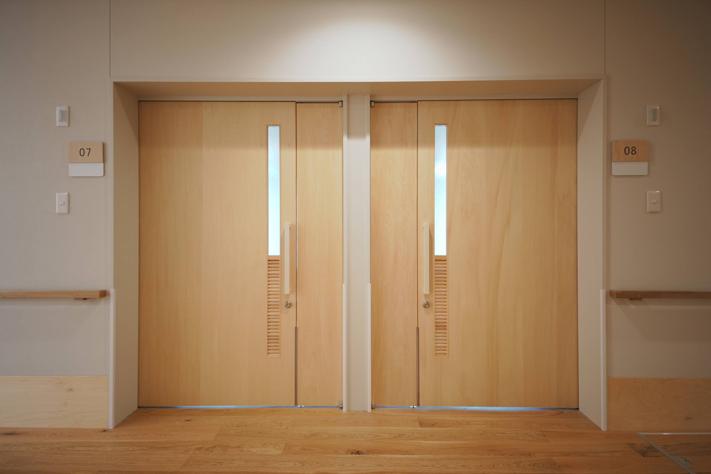 それぞれの居室は窓側に水廻りを配置しています。寝室部分と障子で間仕切りを設けています。この障子をコントロールする事で介護度に合わせた設えとなります。