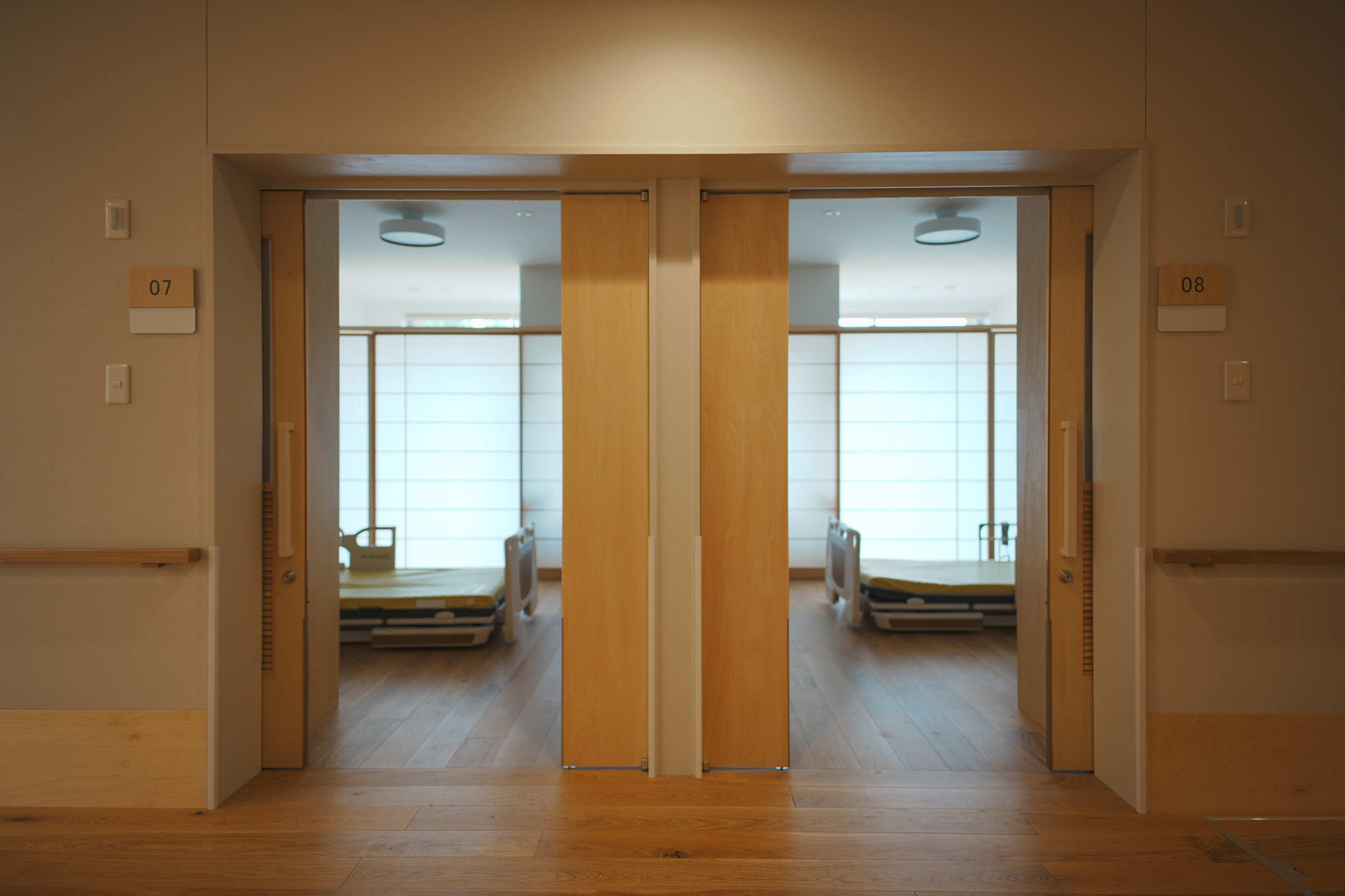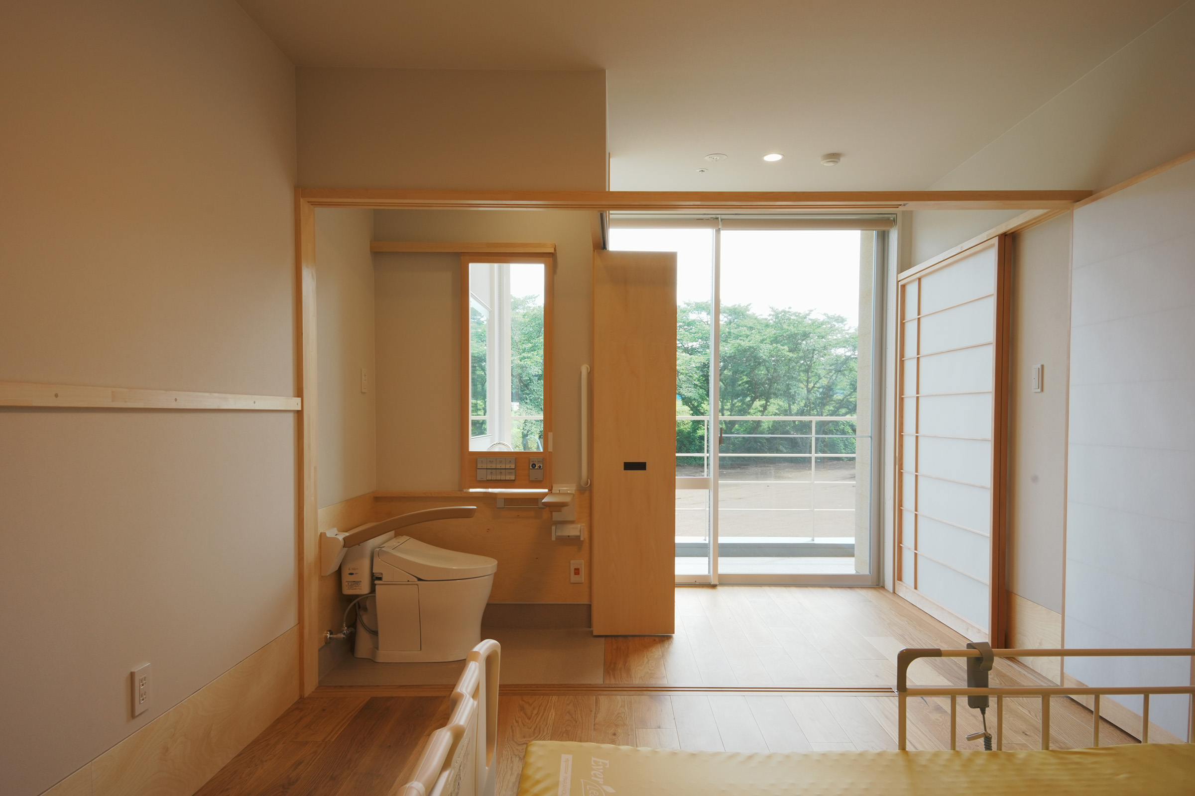 自立した生活ができる段階では障子を閉じたまま使い障子に映る景色の移ろいを楽しむことができます。介護度が上がってきた時は障子を全開としベッドを寄せることで極力自分の力で水廻りを使えるように工夫しています。